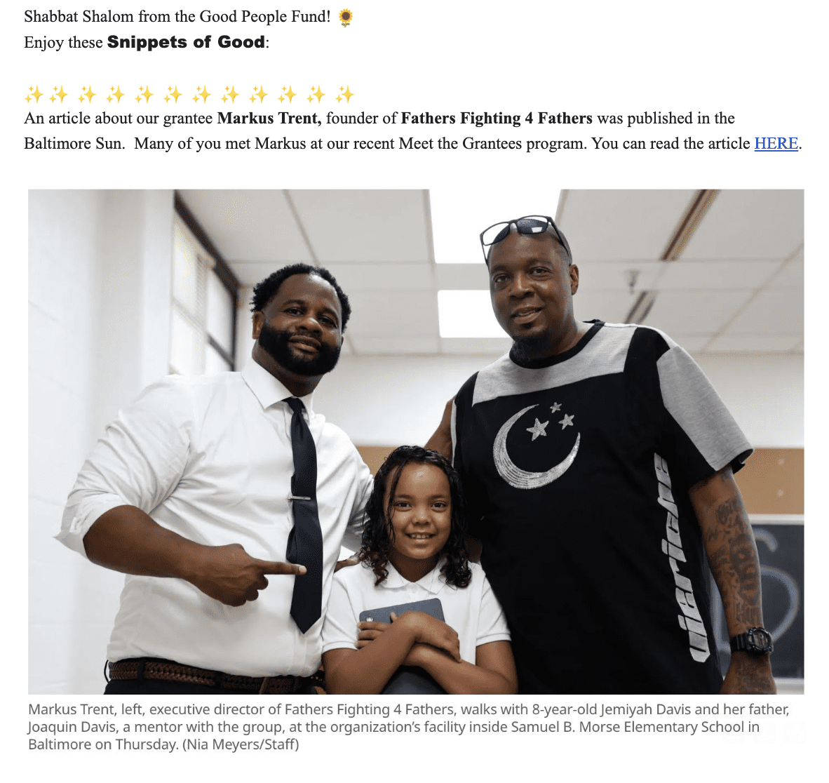 Each Friday Board members receive Shabbat Snippets, a quick recap of what happened that week at GPF. Think about the value of the Snippets as an internal communications tool for GPF.