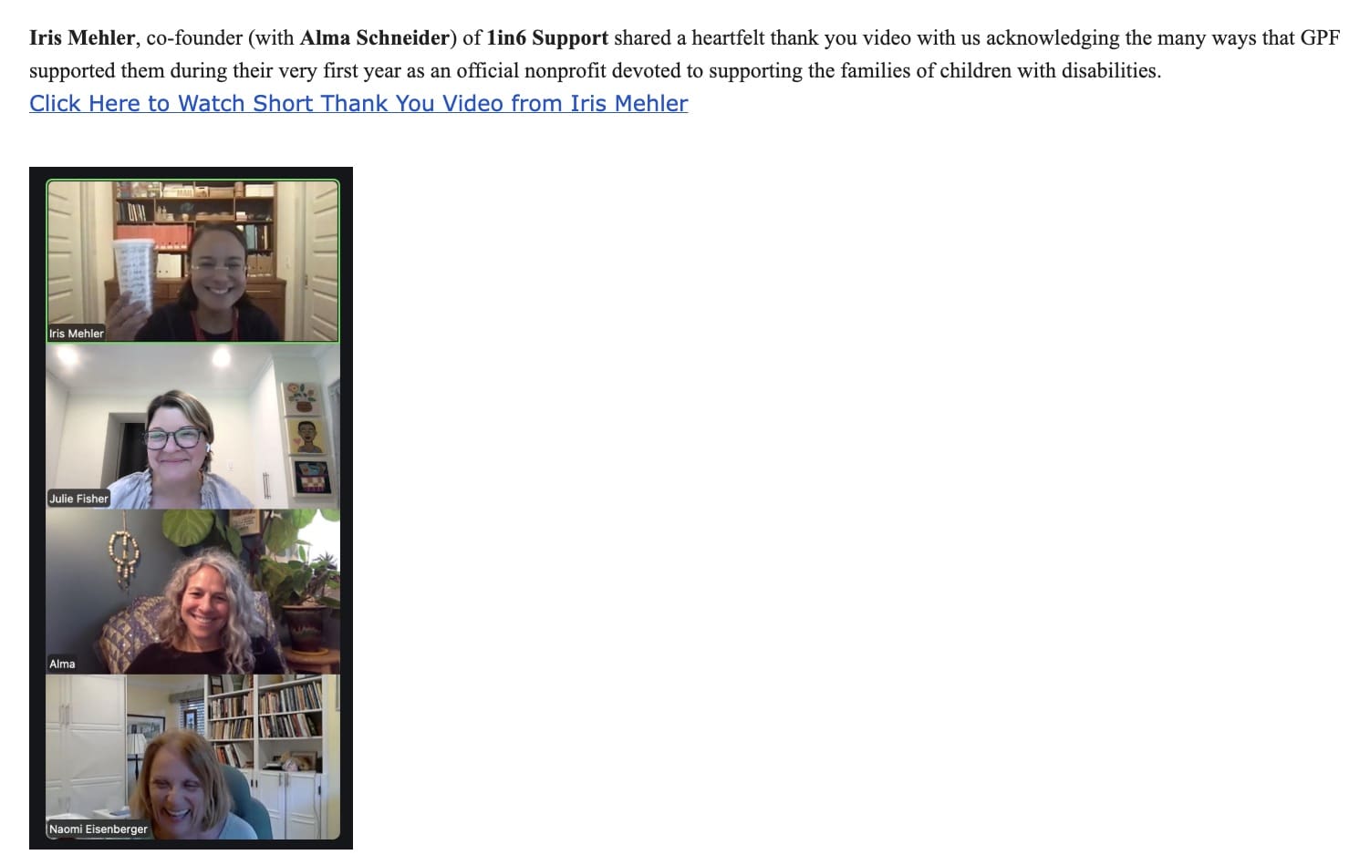 A gratitude snippet! Founders of a grantee said thank you to GPF. GPF staff made sure to share that gratitude video with the Board.